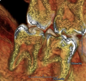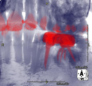 しかし、当院のCTでは写真2・3の様に、多種類の画像バージョンを用いて、 様々な角度から三次元的に顎や歯の状態を見て頂きますので、患者様も御自身のお口の中をより分かりやすく、 より正確に理解して頂くことができます。