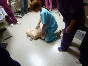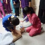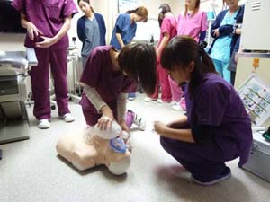 一人ずつ心臓マッサージと気道確保、人工呼吸の練習です。